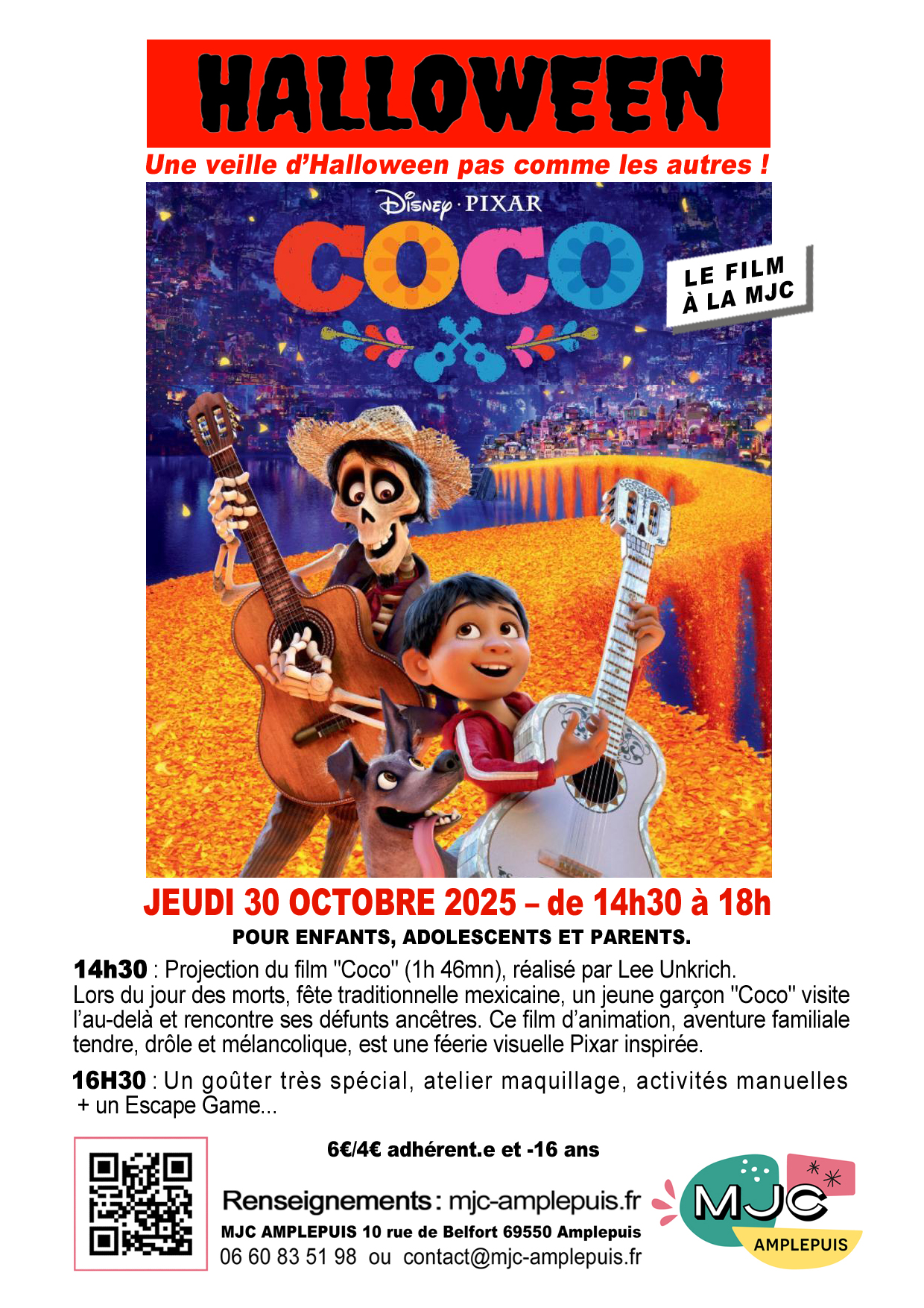 14h30 : Projection du film "Coco" (1h 46mn), réalisé par Lee Unkrich. Lors du jour des morts, fête traditionnelle mexicaine, un jeune garçon "Coco" visite l’au-delà et rencontre ses défunts ancêtres. Ce film d’animation, aventure familiale tendre, drôle et mélancolique, est une féerie Pixar visuelle inspirée. 16H30 : Un goûter très spécial, atelier maquillage, activités manuelles + un Escape Game... (6€/4€ adhérent.e et -16 ans)