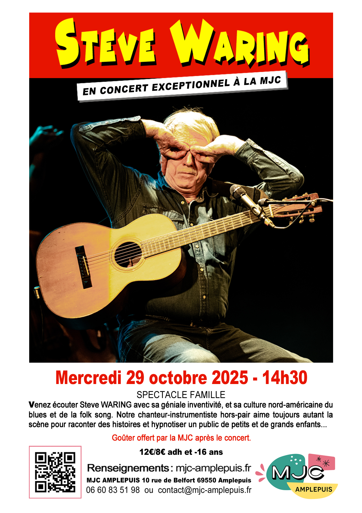 « J’aime amener la musique et mes histoires vers les gens qui m’écoutent. C’est aussi pourquoi j’aime les chansons dites pour les enfants, dans lesquelles je trouve un esprit direct, un rire simple, une poésie sans prétention. » Steve Waring est naturellement associé au jeune public, avec sa géniale inventivité, sa culture nord américaine, le blues, et le folk song. Par sa maîtrise de la guitare et du banjo, Steve Waring est reconnu par tous comme un instrumentiste hors-pair, qui aime la scène, qui sait raconter des histoires et hypnotiser un public de petits et grands. (12€/8€ adh et -16 ans)